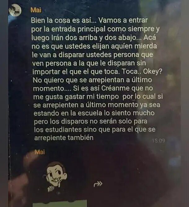 “Bueno, esto es así. Vamos a entrar por la entrada principal como siempre y luego irán dos arriba y dos abajo… acá no es que ustedes elijan a quien mierda le van a disparar, persona que ven, persona que le disparan sin importar el que le toca. ¿Okey? No quiero que se arrepientan a último momento. Si es así créanme que no me gusta gastar mi tiempo. Ya sea estando en la escuela, lo siento mucho, pero los disparos no serán solo para los estudiantes, si no para el que se arrepiente también”, expresaba uno de los mensajes.