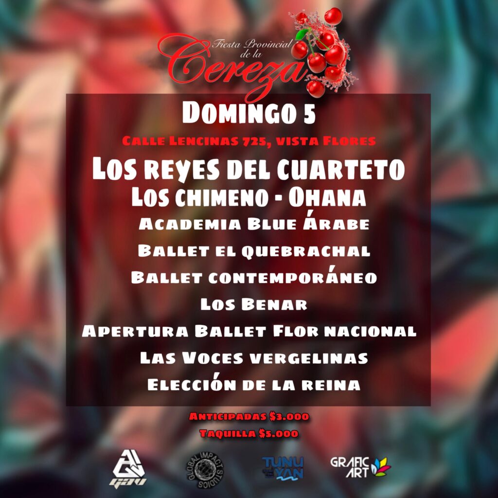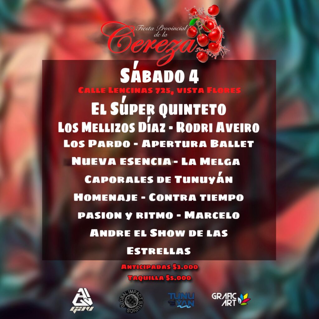 En su 34° edición que tiene como fecha 4 y 5 de enero, en calle Lencinas 725 de Vista Flores, donde se presentarán grandes artistas y se elegirá a la Reina Provincial de la Cereza. Mirá la grilla completa: