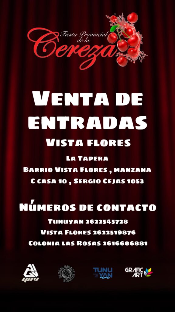 Conseguí ahora tu entrada a través del sitio oficial https://globalimpactstudio.wixsite.com/globalpass/events/fiesta-provincial-de-la-cereza-2025-2025-01-04-21-00 o en los siguientes puntos: