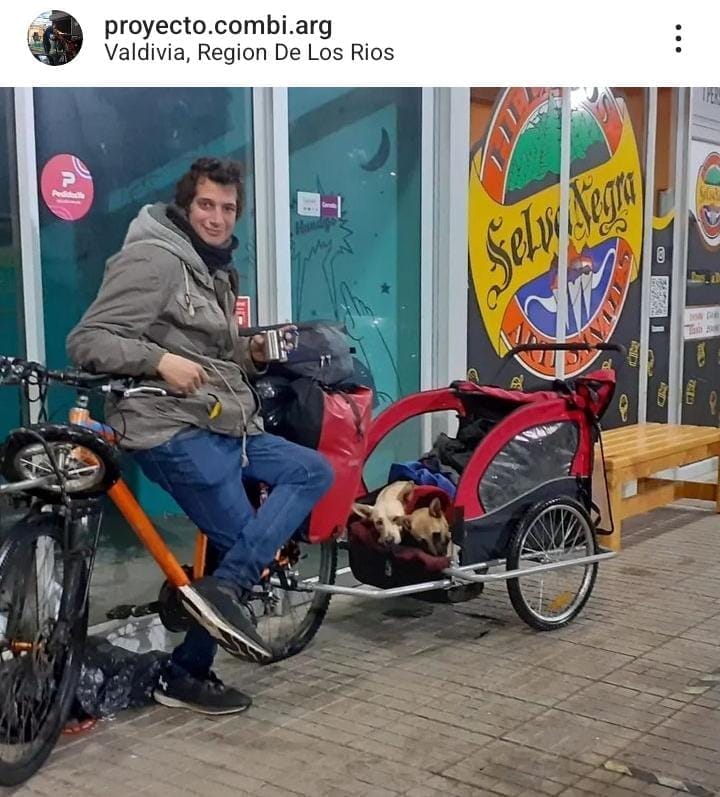 «Los perritos son mis compañeros, los llevo de paseo. Merlin tiene 4 años es de Lima Perú y viaja en bici desde hace dos años en bici, quien también acostumbró a otro pequeño que se sumó al viaje. Es un cachorro de 8 meses que nació en Los Ángeles, Chile».