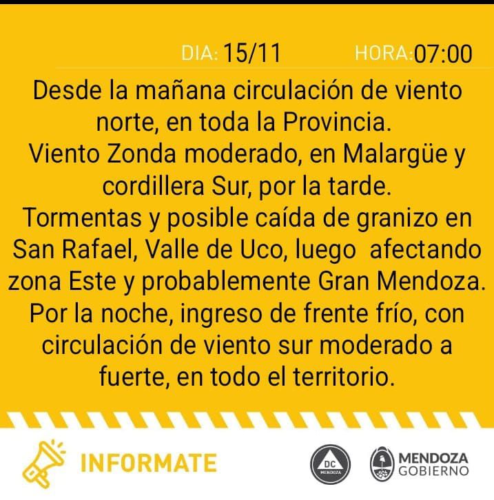 El comunicado detalla desde la mañana, «ocurrencia de viento norte en toda la provincia. Viento Zonda moderado en Malargüe y cordillera del sur por la tarde».