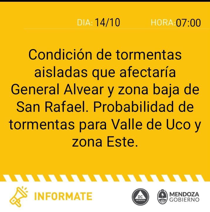 El Valle de Uco, se encuentra bajo alerta amarilla según un comunicado emitido desde Defensa Civil, por este motivo se solicita tomar las precauciones necesarias sobre todo a la hora de conducir por las diferentes rutas y caminos.
