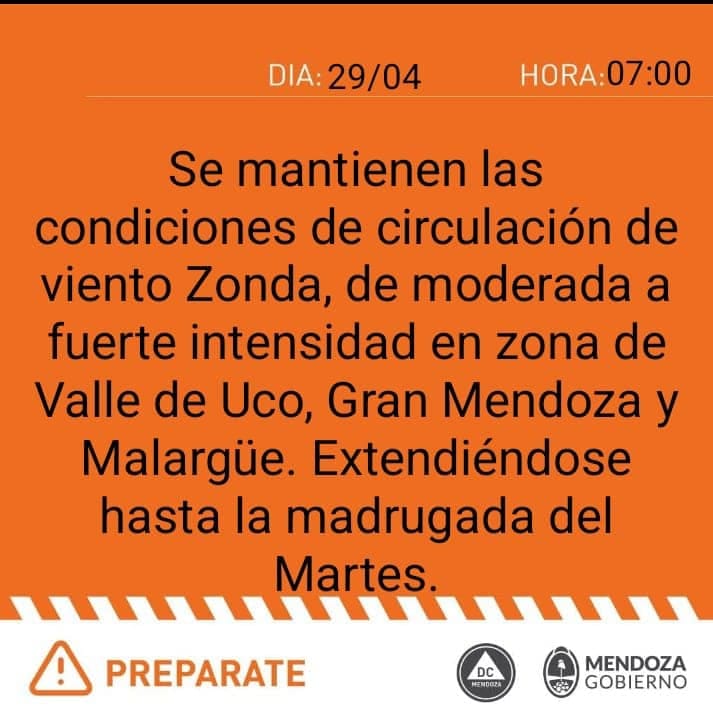 Desde Defensa Civil de la provincia, emitieron un comunicado por pronóstico de Zonda para la jornada de este lunes. Hay alerta naranja, por la circulación de viento con intensidad de «moderada a fuerte en el Valle de Uco, Gran Mendoza y Malargüe. Extendiéndose hasta la madrugada del martes».