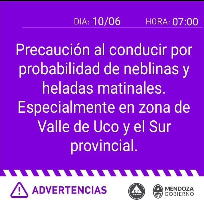«Precaución al conducir por probabilidad de neblina, y heladas matinales. Especialmente en zonas del Valle de Uco y sur provincial».