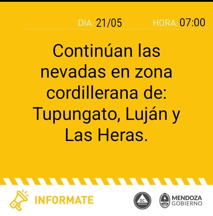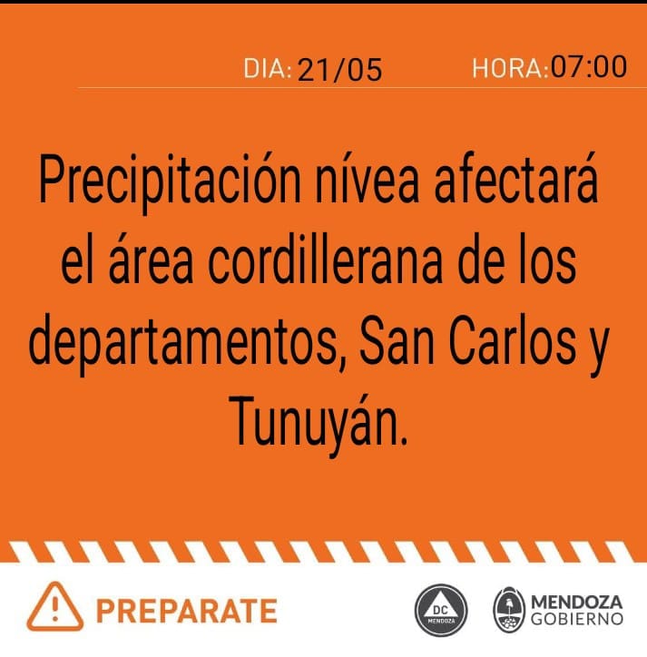 Desde defensa civil, emitieron alerta naranja, detallando «precipitación nívea que afectará el área cordillerana de los departamentos San Carlos y Tunuyán». Y otra amarilla ya que «continúan las nevadas en la cordillera de Tupungato, Luján y Las Heras».