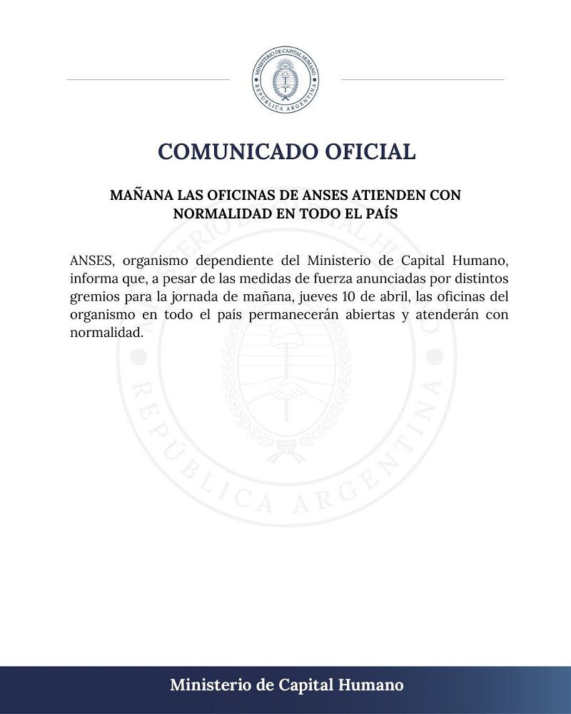 En un comunicado oficial, se dio a conocer que «a pesar de las medidas de fuerza anunciadas por distintos gremios para la jornada de mañana, jueves 10 de abril, las oficinas del organismo en todo el país permanecerán abiertas y atenderán con normalidad».