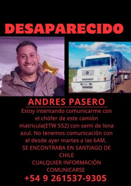 «No me contesta el teléfono y me dejó de reportar el satelital en la zona de Santiago de Chile. Por si alguno lo ve por favor avisar. Contacto 2616683344”,  sentencia.