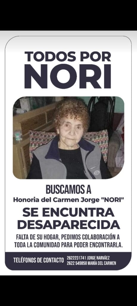 Honoria, tiene 86 años, salió de su domicilio ubicado en calle Fuerte San Carlos, Barrio Urquiza de Tunuyán. En comunicación con 8 DIGITAL, sus familiares contaron que fue vista por última vez entre las 14 y 16 hs del lunes 06 de mayo.