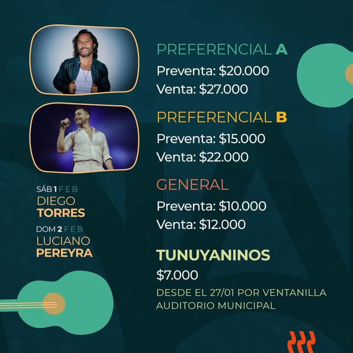 Los ciudadanos con domicilio en Tunuyán podrán acceder a una entrada con precio exclusivo de $7.000 desde el 27 de enero, disponible sólo en ventanilla del Auditorio Municipal de Tunuyán.