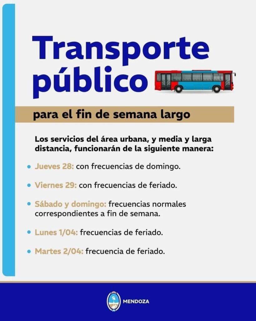 El gobierno dio a conocer el funcionamiento que tendrá el Transporte Público de Pasajeros desde el Jueves Santo hasta el martes  2 de abril, feriado por los Caídos en Malvinas.