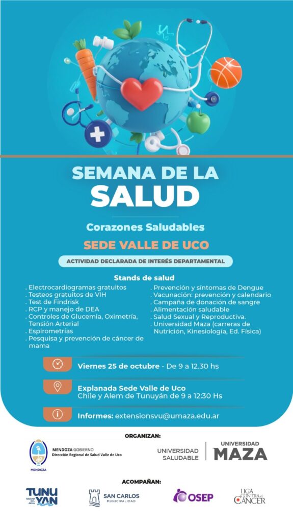 Este viernes, se vivirá una gran campaña de salud en Tunuyán será en la explanada de la Universidad Maza, sede Valle de Uco ubicada en la esquina de calles Chile y Alem de 9 a 12:30 hs.