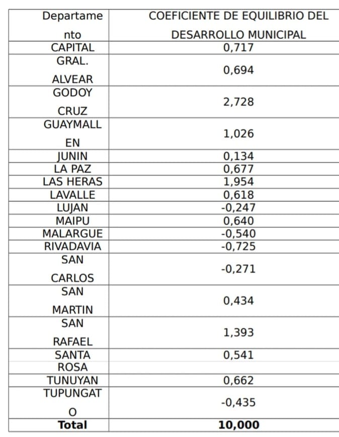 También son llamativos los casos de Santa Rosa, Malargüe y Tunuyán, que según en los números de noviembre veían una baja en el coeficiente, y con los propuestos ahora ven una suba. Y el de San Carlos que ahora mantiene el coeficiente, mientras que en el proyecto del año pasado se registraba una baja.