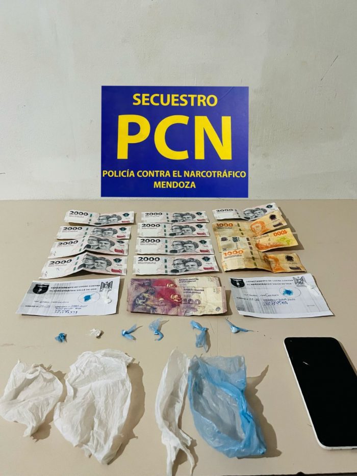 Uno de los procedimientos ocurrió en la intersección de las calles San Martín y Vílchez, en San Carlos, donde fue detenido un hombre de 35 años. En el lugar, los efectivos secuestraron ocho envoltorios de nailon termosellados con cocaína, un teléfono celular, cuatro recortes de nailon y $21.200.