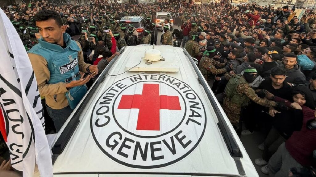 Este mediodía también se difundieron imágenes de una multitud que rodeaba los vehículos de la Cruz Roja, mientras las tres jóvenes israelíes bajaban de las camionetas de Hamás y suben a los vehículos de la Cruz Roja.