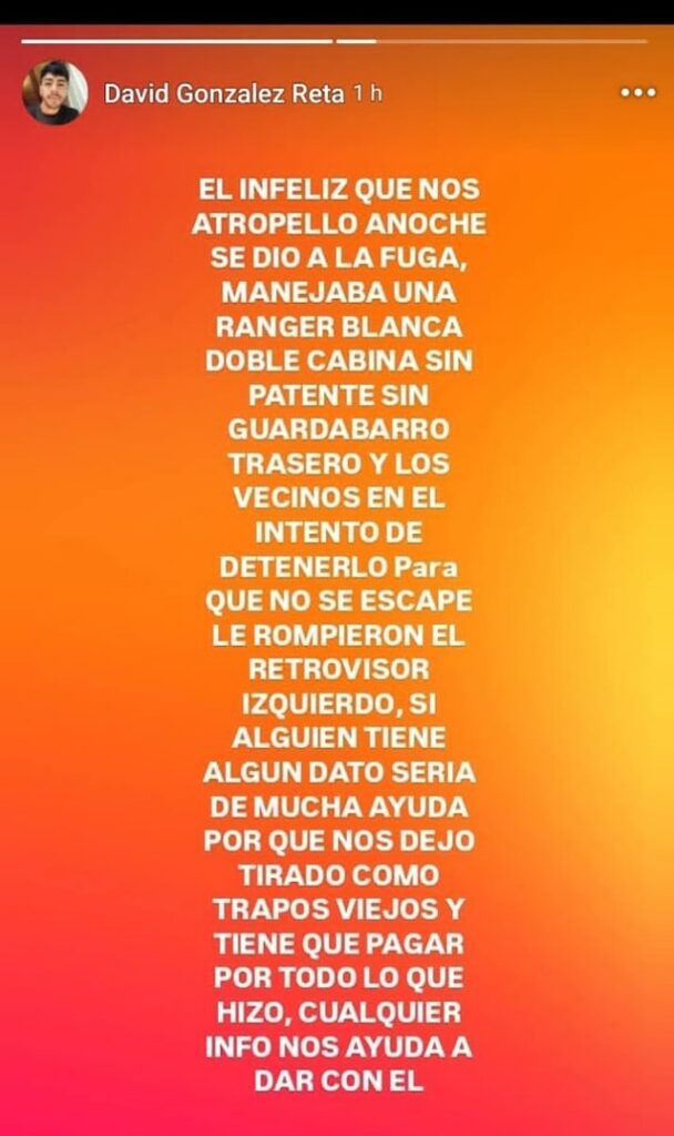 «Los chicos iban por calle Independencia, y en la Centroamérica apareció la camioneta blanca que los chocó y luego se dio a la fuga. Los vecinos en el intento de evitar que huya, le rompieron el espejo izquierdo, y en la huida, al hacer marcha atrás, pisó a Claudio, nuevamente, y le explotó las piernas. Iba sin patente» relató Karen, hermana de uno de los jóvenes, a Info YA.