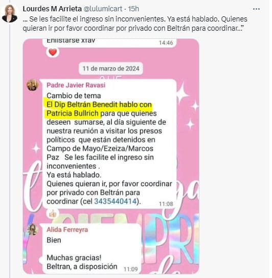 Todo se inició con un grupo de WhatsApp que se creó en febrero y se llamó `Comida informal con el Padre Javier…´ con una foto de perfil del libro “El Pacto”, en clara referencia a la finalidad que hoy les voy a contar”, comienza la publicación en la que se muestra como el padre Javier Ravasi agregó a un grupo a varios legisladores de La Libertad Avanza con el objetivo de dialogar de manera informal.