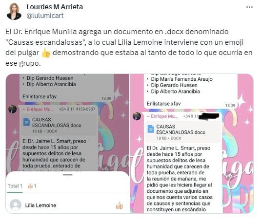 En ese grupo se convoca a una “reunión y reservada por tema proyecto milit” y se enumeran los confirmados diputados y los abogados Ricardo Saint Jean, Laura Olea, el ex juez de la Casación destituido por supuestos cobros de coimas y vinculado a agentes de la SIDE, Eduardo Riggi”, agregó la legisladora mendocina.