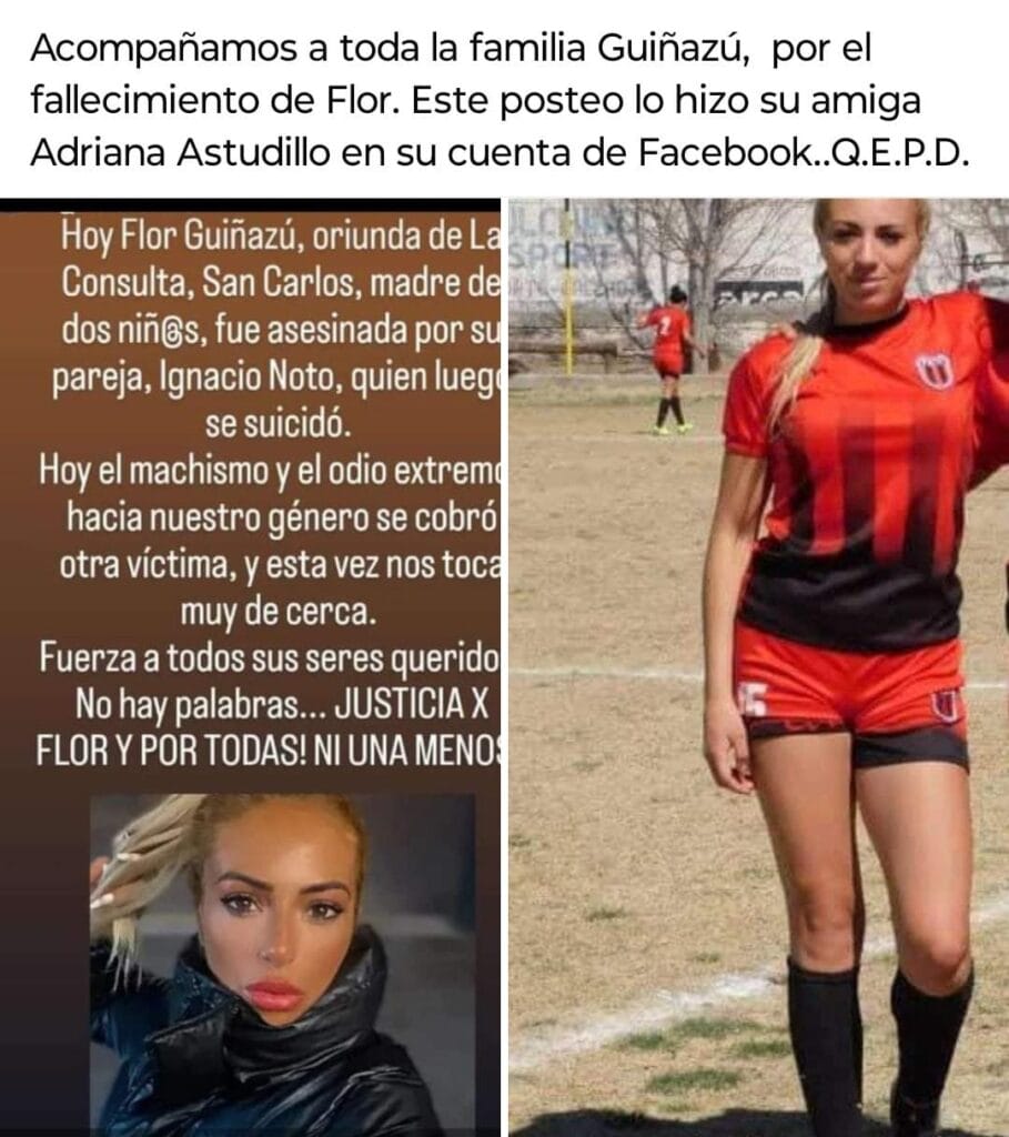 “Flor era oriunda de La Consulta, era Técnica en Higiene y Seguridad Laboral, amaba el deporte, entrenaba fútbol, rugby y crossfit. Una mujer hermosa y supermodelo en redes sociales que también era mamá de dos niños de 7 y 5 años. El femicida Ignacio Agustín Noto, la mató a golpes y luego el cobarde se quitó la vida”.