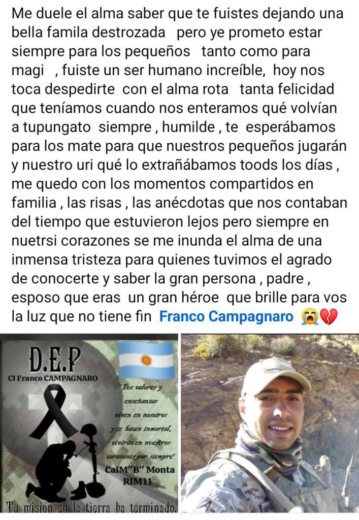 Un trágico accidente en Tupungato se cobró la vida de un joven ayer, en horas de la tarde noche. La víctima fatal fue identificada como Franco Campagnaro, quien era integrante del Ejército Argentino con funciones en el RIM 11.
