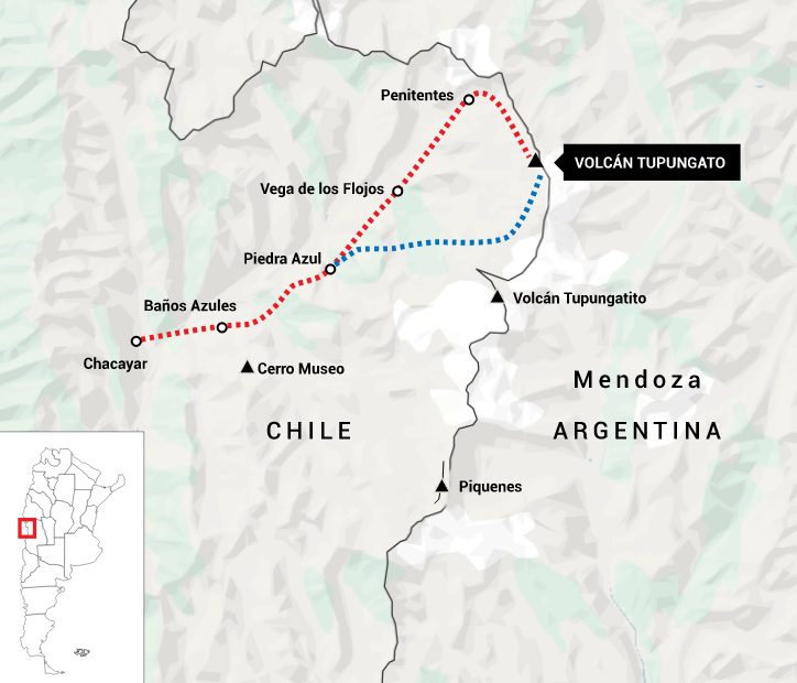 Su destino del otro lado de la Cordillera de los Andes en la región de San José del Maipo, a una hora de Santiago, y por donde se puede acceder, entre otros picos, cerros y volcanes, al volcán Tupungato en el país trasandino.