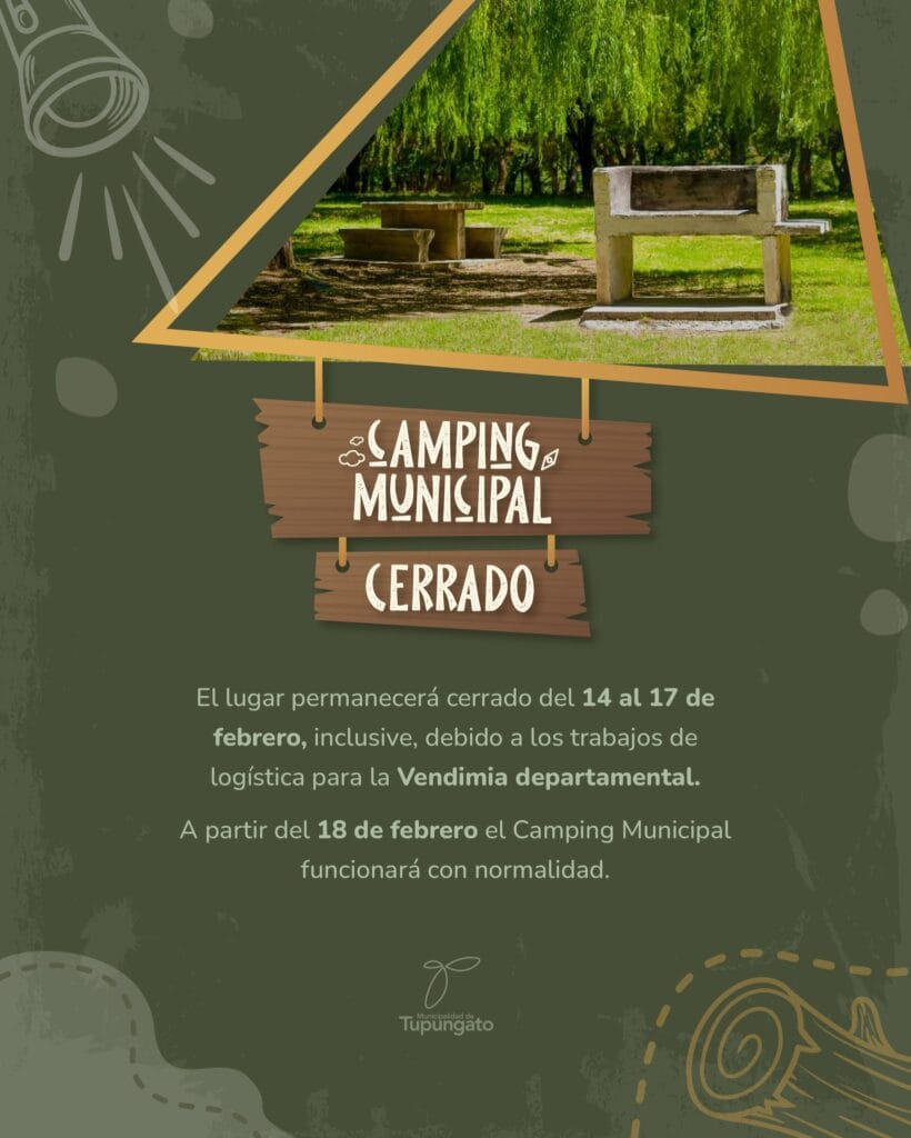 A través de un comunicado, la municipalidad de Tupungato informó que «debido a los preparativos para la Vendimia departamental «El Nogal de la Esencia», nuestro camping estará temporalmente cerrado del 14 al 17 inclusive».
