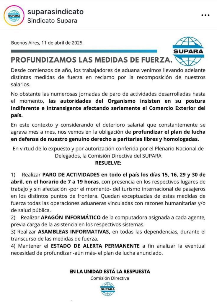 También, habrá cese de las actividades de personal de Aduana. El mismo está previsto los días 15, 16, 29 y 30 de abril, de 7 a 19, con presencia en los respectivos lugares de trabajo y sin afectación, por el momento, del turismo internacional de pasajeros en los distintos puntos de la frontera.