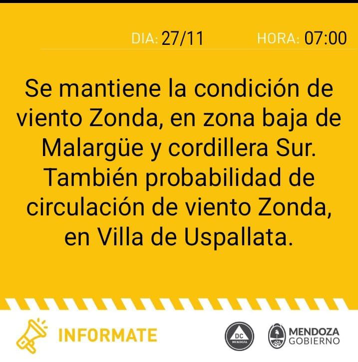 Por su parte, Defensa Civil emitió alerta amarilla, detallando que «se mantiene la condición de Zonda, en zona baja de Malargüe y cordillera sur».