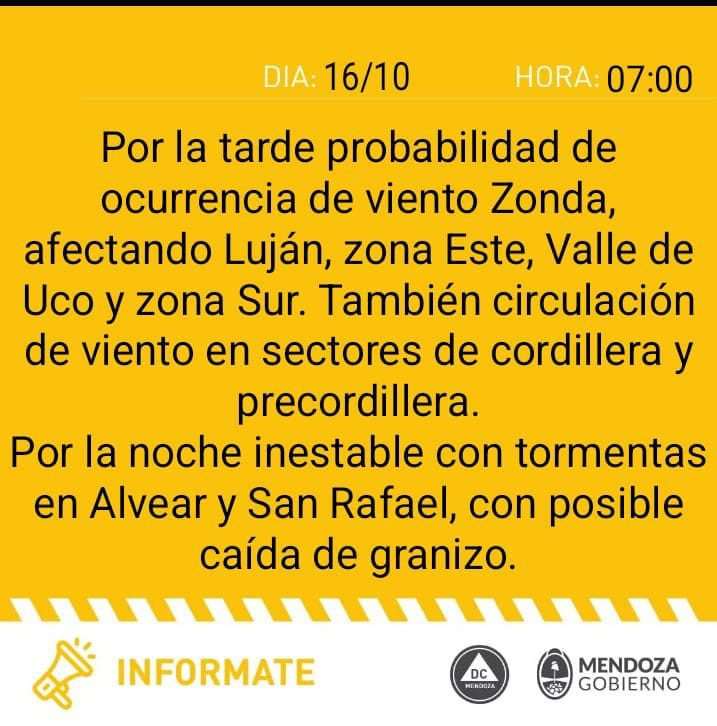 Aunque contingencias anuncia en su pronóstico que las ráfagas de viento soplarían en la precordillera, un comunicado de defensa civil advirtió, «por la tarde ocurrencia de Zonda afectando Luján, Valle de Uco, zona este y sur».