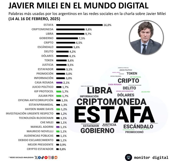 El primer mandatario argentino promocionó un token, llamado $LIBRA, para «incentivar inversiones y financiar a emprendedores». Esto afectó alrededor de 40.000 usuarios con pérdidas millonarias. En pocas horas se potenció la negatividad en la conversación digital del público general y fue cuestionado por la comunidad cripto.  Según un estudio de Monitor Digital, el escándalo consolidó «estafa» como la principal palabra clave utilizada en redes para atacar la figura del Presidente.