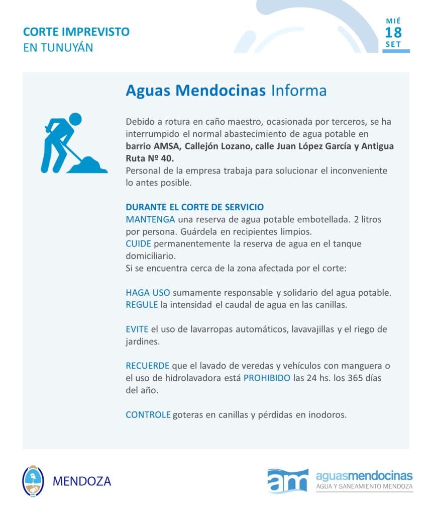 A través de un comunicado oficial Aguas Mendocinas adviritó a vecinos de Tunuyán que debido a la rotura de un caño maestro, el suministro de agua potable se verá interrumpido.