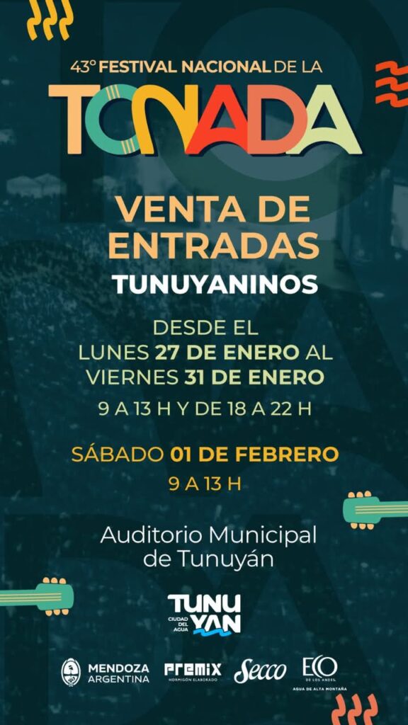 La Municipalidad de Tunuyán recuerda a todos los vecinos que hasta las 13 horas de este sábado se venderán las entradas exclusivas para tunuyaninos en las boleterías del Auditorio Municipal para el Festival Nacional de la Tonada