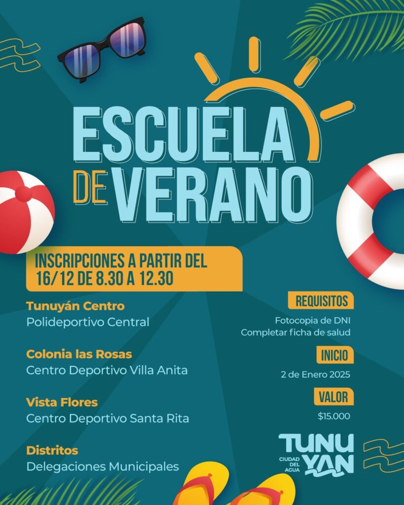 La Escuela de Verano 2025 de la Municipalidad de Tunuyán ya tiene fecha de inicio. A partir de este lunes 16 de diciembre podrás inscribirte de 8:30 a 12:30 en los lugares indicados: