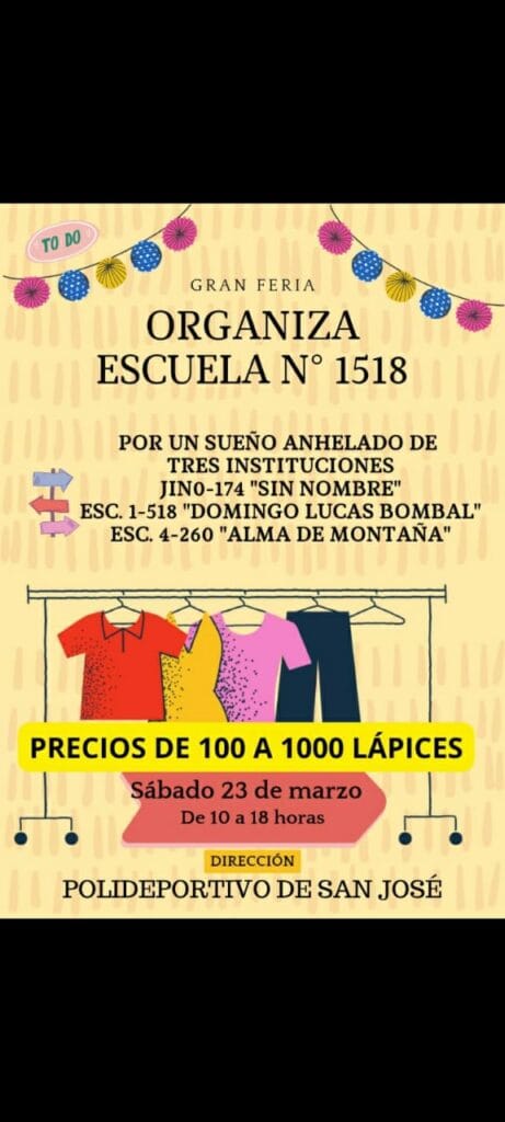Se trata de las escuelas 1-518 Domingo Lucas Bombal, 4-260 Alma de Montaña y JINO- 174 Sin Nombre, quienes ofrecerán productos de 100 a 1.000 pesos.
