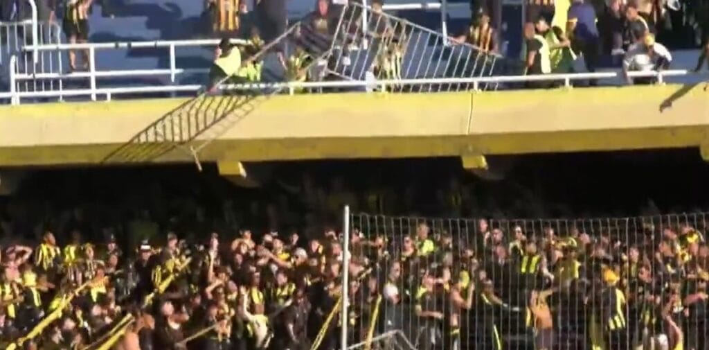 Los hinchas de Peñarol observaron que iban a ser agredidos y corrieron hacia un costado. De lo contrario, el peso de esas vallas podría haber tenido consecuencias fatales si impactaba en una persona.