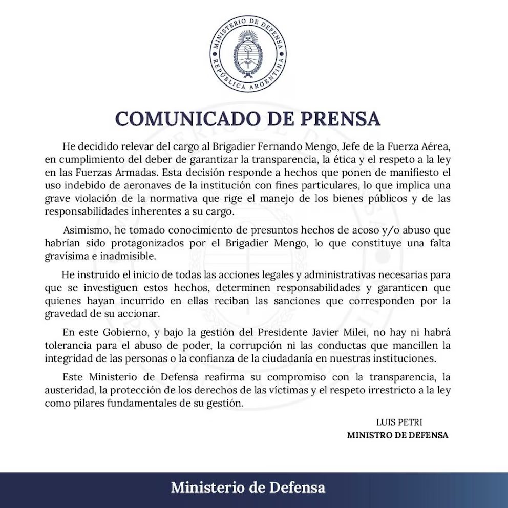 “He decidido relevar del cargo al Brigadier Fernando Mengo, Jefe de la Fuerza Aérea, en cumplimiento del deber de garantizar la transparencia, la ética y el respeto a la ley en las Fuerzas Armadas. Esta decisión responde a hechos que ponen de manifiesto el uso indebido de aeronaves de la institución con fines particulares, lo que implica una grave violación de la normativa que rige el manejo de los bienes públicos y de las responsabilidades inherentes a su cargo”, señala el comunicado oficial del Ministerio de Defensa.
