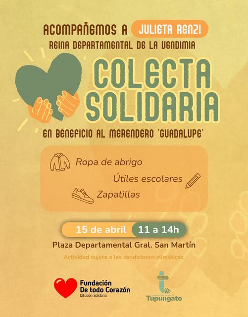 En el marco de acciones conjuntas que lleva adelante nuestra Reina departamental de la Vendimia 2025,Julieta Renzi con la Fundación De Todo Corazón, y con el objetivo de fortalecer su labor comunitaria, la soberana invita a que los tupungatinos brindemos nuestro aporte en la Colecta Solidaria a favor del Merendero Guadalupe.