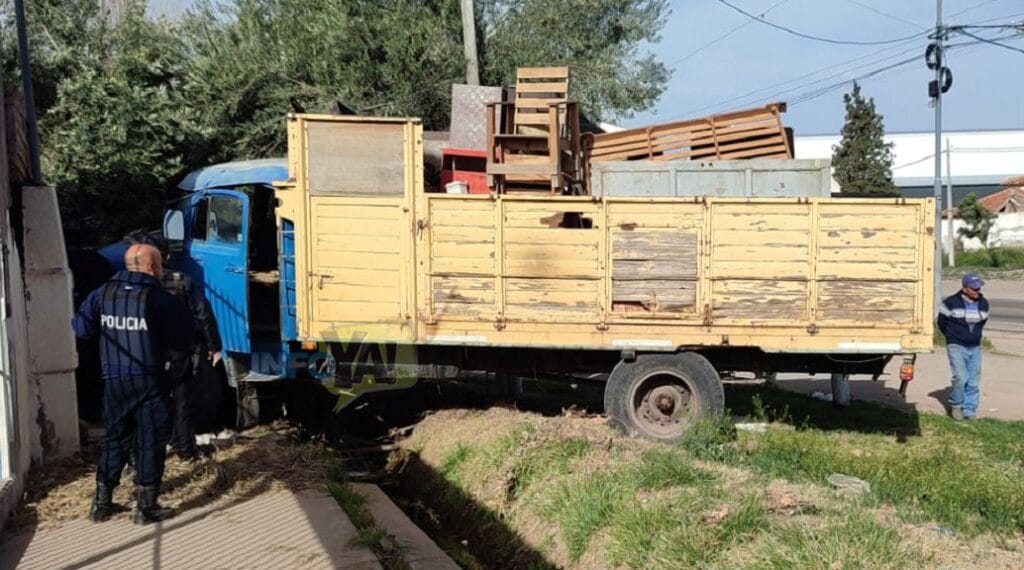 Ocurrió esta tarde, aproximadamente a las 16:30 hs. en San Rafael cuando un viejo camión Mercedes Benz, que aparentemente realizaba una mudanza, se quedó sin frenos en calle Los Dos Álamos de Cuadro Nacional, y terminó impactando contra la pared de un depósito de un conocido acopiador de frutas.