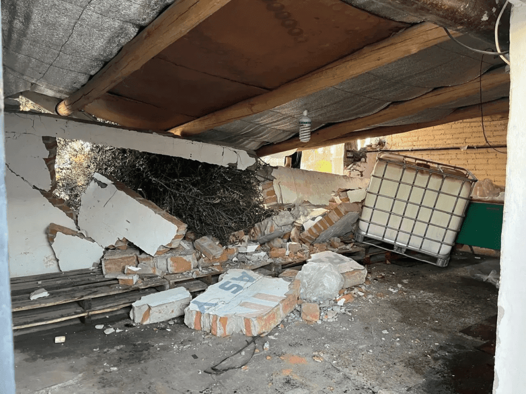Tras arrojarse del vehículo el conductor y el acompañante, el camión sin control cruzó la ruta nacional 146 sin detenerse y terminó impactando contra la pared del depósito de «Acopio Indisur«, ubicado en Av. Mitre 4.025.