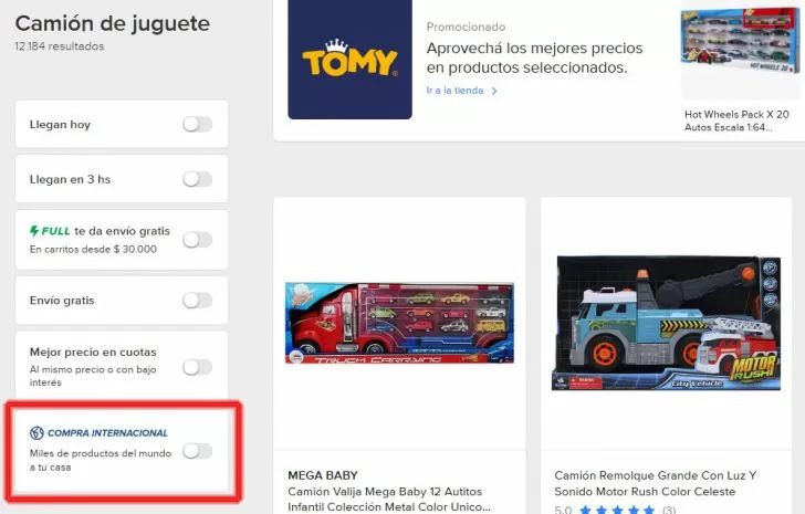 En la plataforma de Mercado Libre para la Argentina ya se pueden encontrar productos que llegan al país desde el exterior y están identificados con la leyenda «Compra internacional». Además, la plataforma agregó un filtro en la barra lateral izquierda para que el usuario pueda encontrarlos fácilmente.