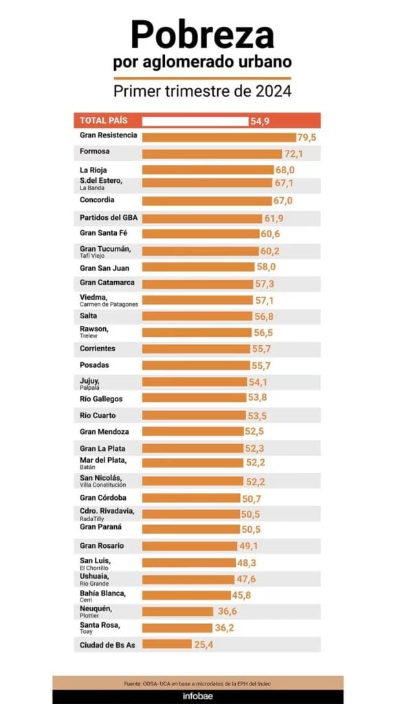 Le sigue Formosa con un 72% de pobres y Santiago del Estero– La Banda con casi 30% de indigentes.