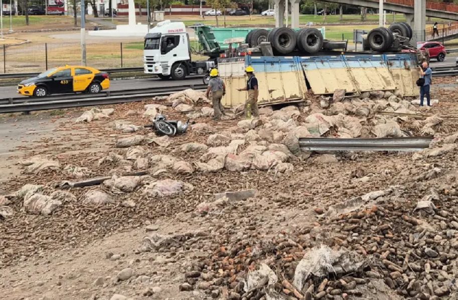 Volcó un camión en el Acceso Sur: un motociclista fue alcanzado por la carga