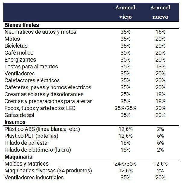 El listado de bienes finales con nuevo arancel para importación lo completan las motos, bicicletas, el café molido, energizantes, ventiladores, calefactores eléctricos, cafeteras, pavas y hornos eléctricos, cremas solares y desodorantes, focos, tubos y artefactos LED y gafas de sol. Todos ellos pasan de un 35% a un 20% de impuestos, con excepción de las cremas solares y desodorantes que tendrán una alícuota del 18%.