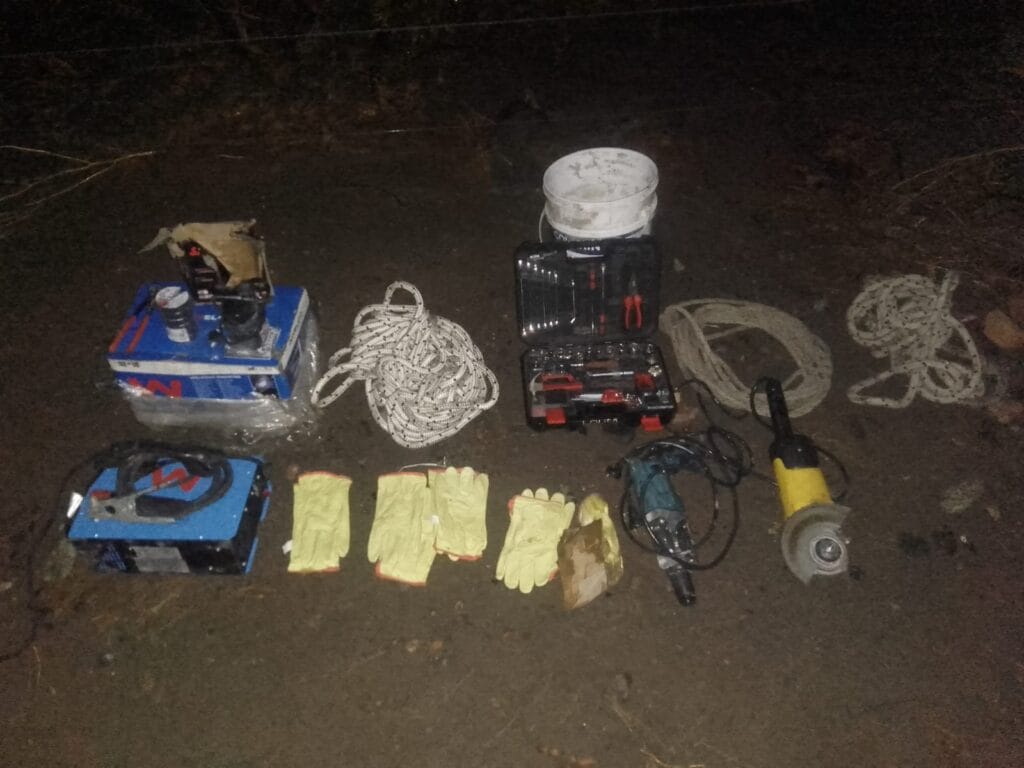 Así, entre los efectivos y los habitantes del lugar, fueron recorriendo todo el predio, el cual es de muchas hectáreas, donde fueron dando con los elementos sustraídos, logrando recuperar una máquina soldadora de la marca Awelco, de color azul; un tacho de 20 litros que en su interior guardaba una pinza, cinta aisladora, una lijadora de palma marca Skil, y 5 pares de guantes. También se encontró un taladro roto percutor Makita, una amoladora de la marca Stanley, y un maletín conteniendo varias llaves de trabajo, una pinza, un destornillador plano, un acople para tubos, llaves de boca y estrías, tubos de diferentes medidas con su llave correspondiente, un Martillo, una pinza de punta, y un juego de llaves Allen.