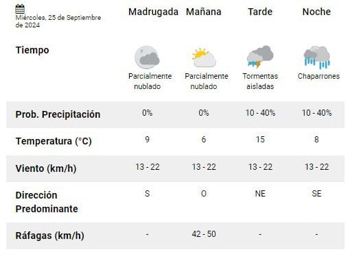 “Mayormente nublado y ventoso con precipitaciones aisladas, descenso de la temperatura, vientos moderados del sector sur. Nevadas en cordillera, y una temperatura máxima alrededor de los 19ºC, en tanto que la mínima rondará los 7ºC”.