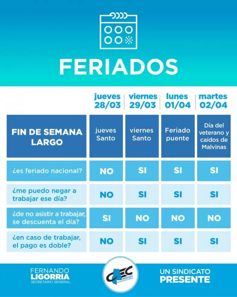 El Viernes Santo (29 de marzo) es feriado nacional por lo que los trabajadores del comercio no están obligados a prestar servicios. Si así lo hicieran el día se abonará como doble jornada y de no asistir el empleador no podrá descontar el día.