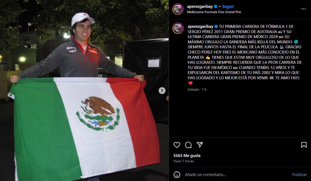 En este marco, en medio de la expectativa de los mexicanos sobre la probable salida de Checo, su padre, Antonio Pérez Garibay, realizó una publicación en su cuenta de Instagram donde sugiere que su hijo tuvo su última carrera el fin de semana pasado en México.
