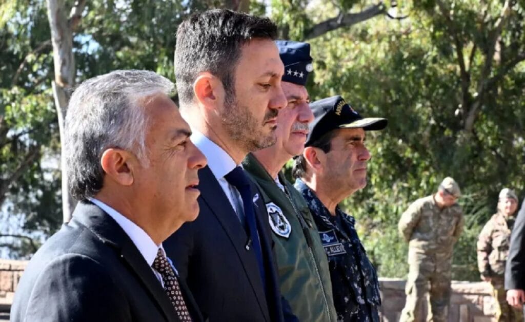 Al pie del monumento al Monumento al Ejército de los Andes, en el cerro de La Gloria, el ministro de defensa pronunció un enérgico discurso, acompañado del Gobernador Cornejo, la vicegobernadora Casado y otras autoridades, en el marco del 214° aniversario del Ejército Argentino.