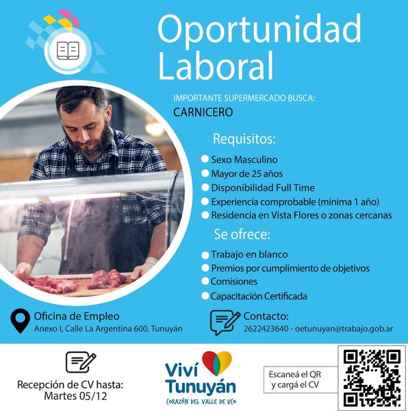 La oficina de empleo de la municipalidad de Tunuyán, compartió nuevas ofertas laborales. Son dos los puestos a cubrir, se encuentran en la búsqueda de guardavidas y carnicero.