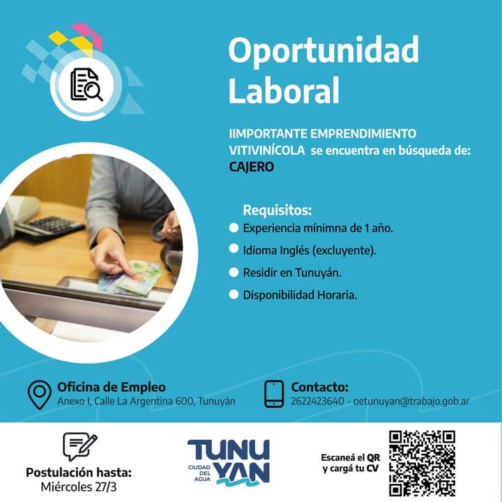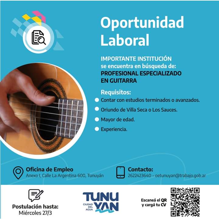 La Oficina de Empleo lanzó una nueva oportunidad laboral, dos empresas del Valle de Uco solicitan, por un lado, cajero y profesional especializada en guitarra.