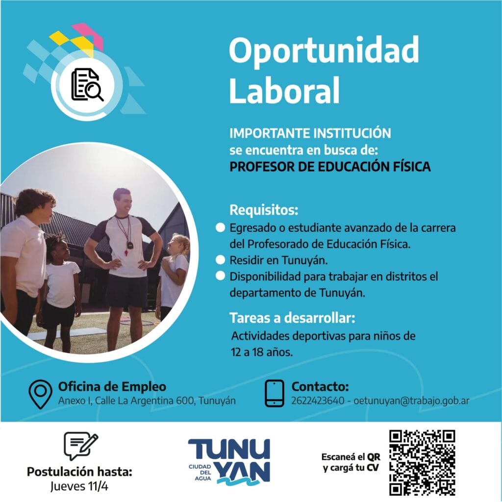 Hay tiempo de cargar e CV hasta el próximo jueves 11 de abril. Para dudas o consultas pueden tomar contacto a través de 2622423640.